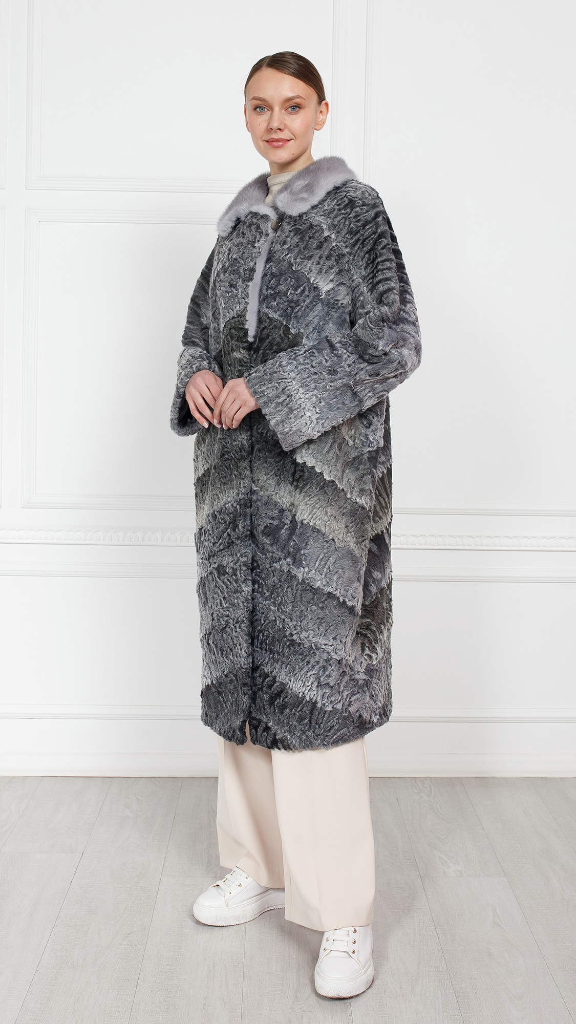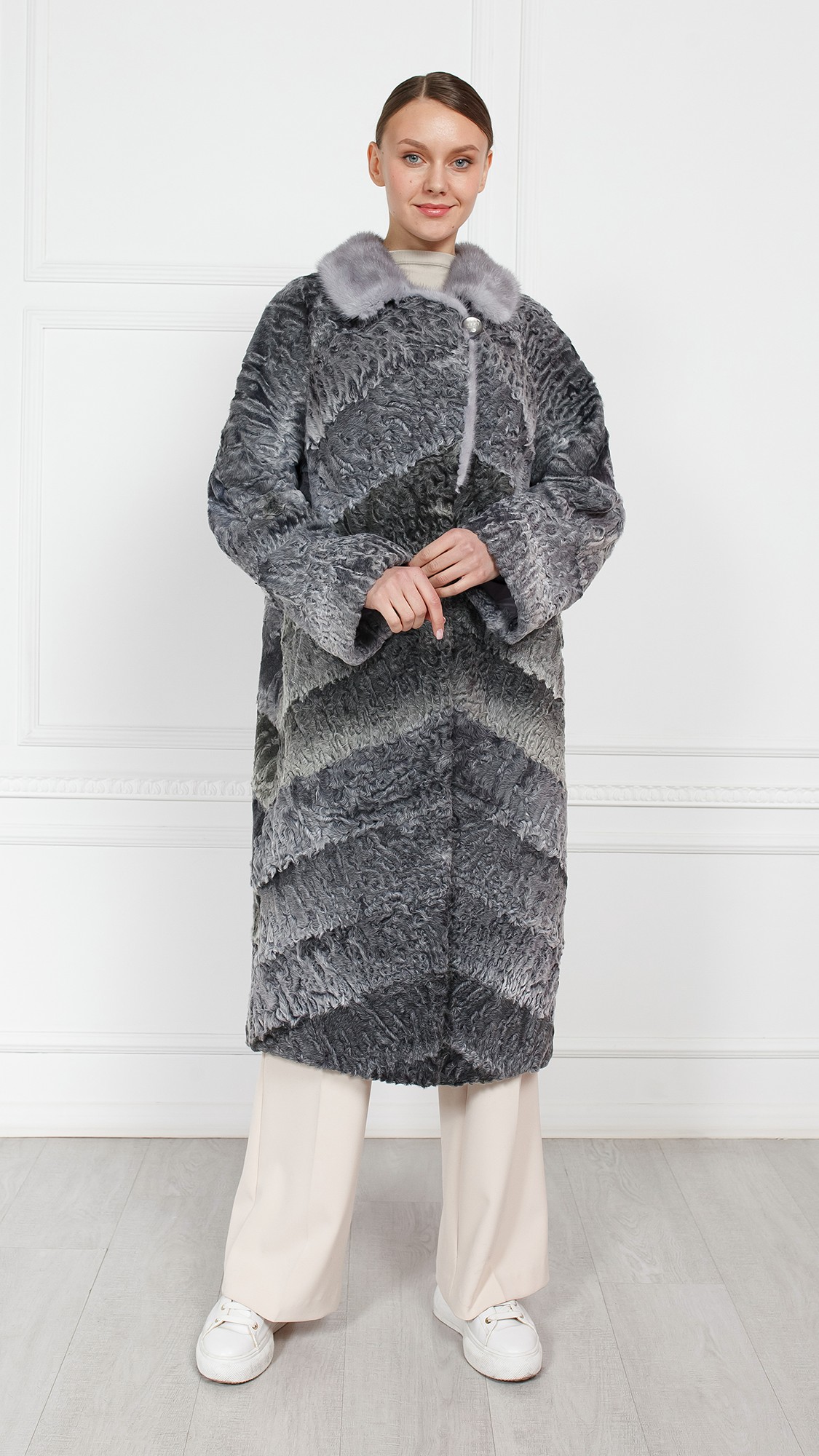 Шуба из каракуля, отделка норка